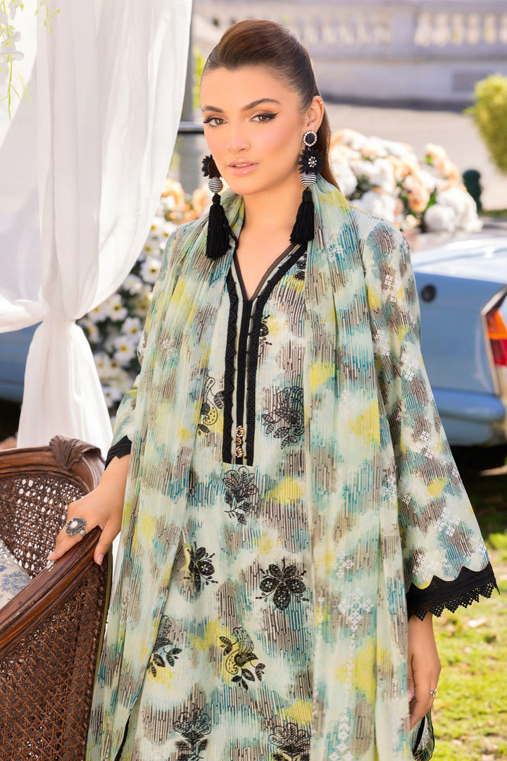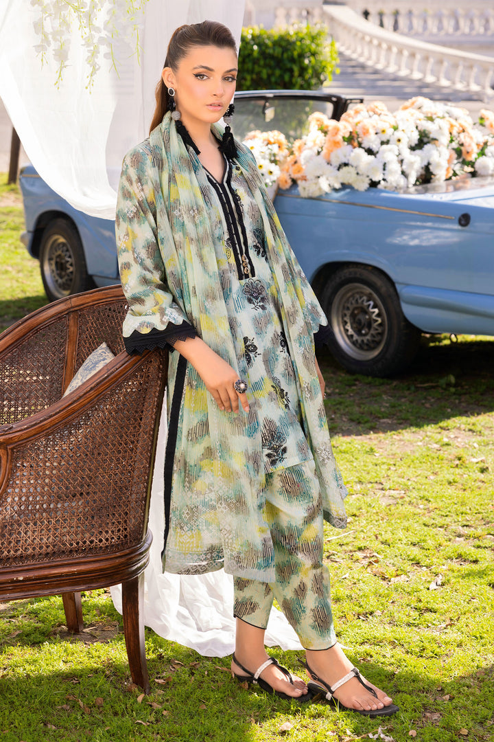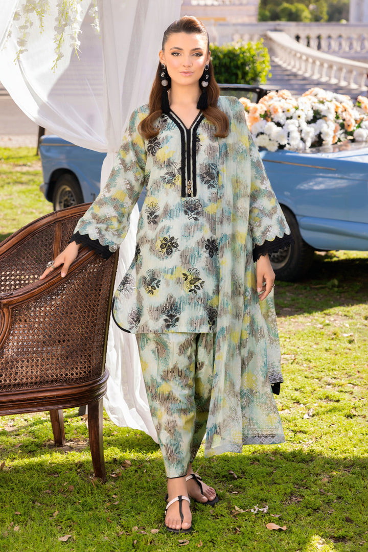 Front fine lawn suit with digital print chicken kari embroidery Dupatta made of chiffon with the same digital print as the suit Trouser crafted from plain cotton