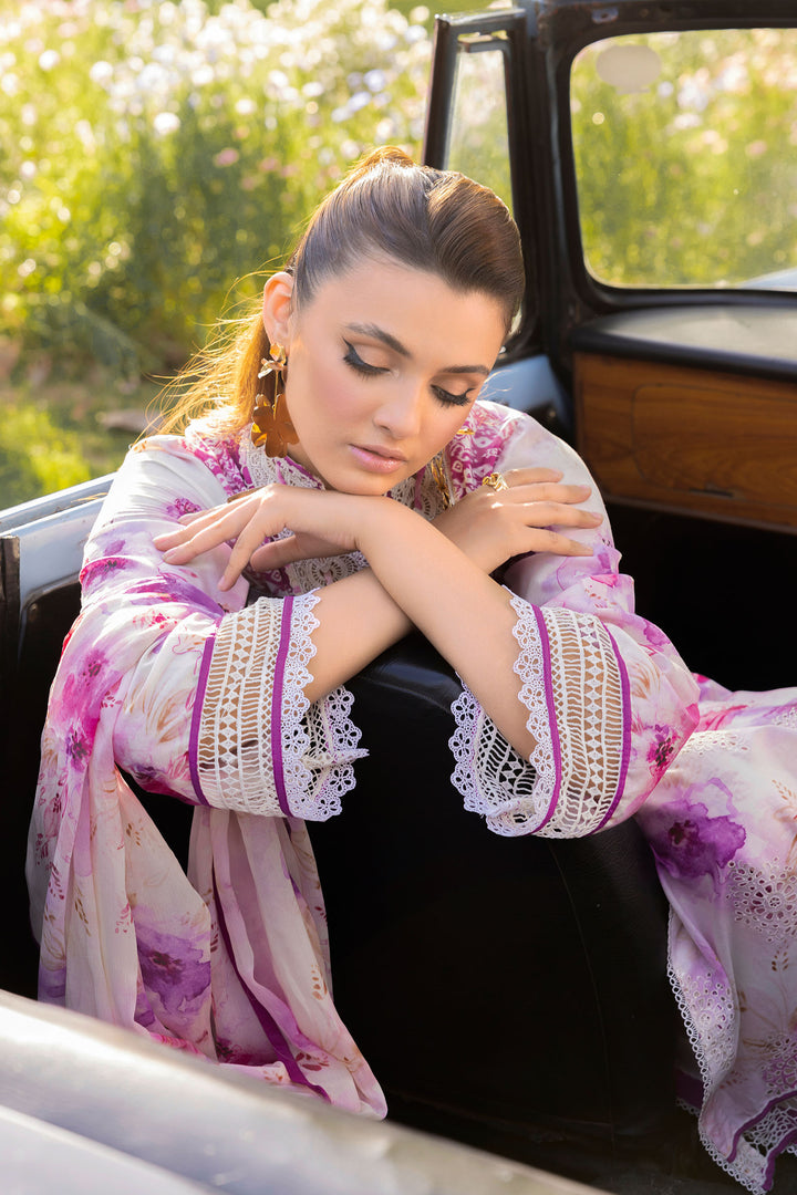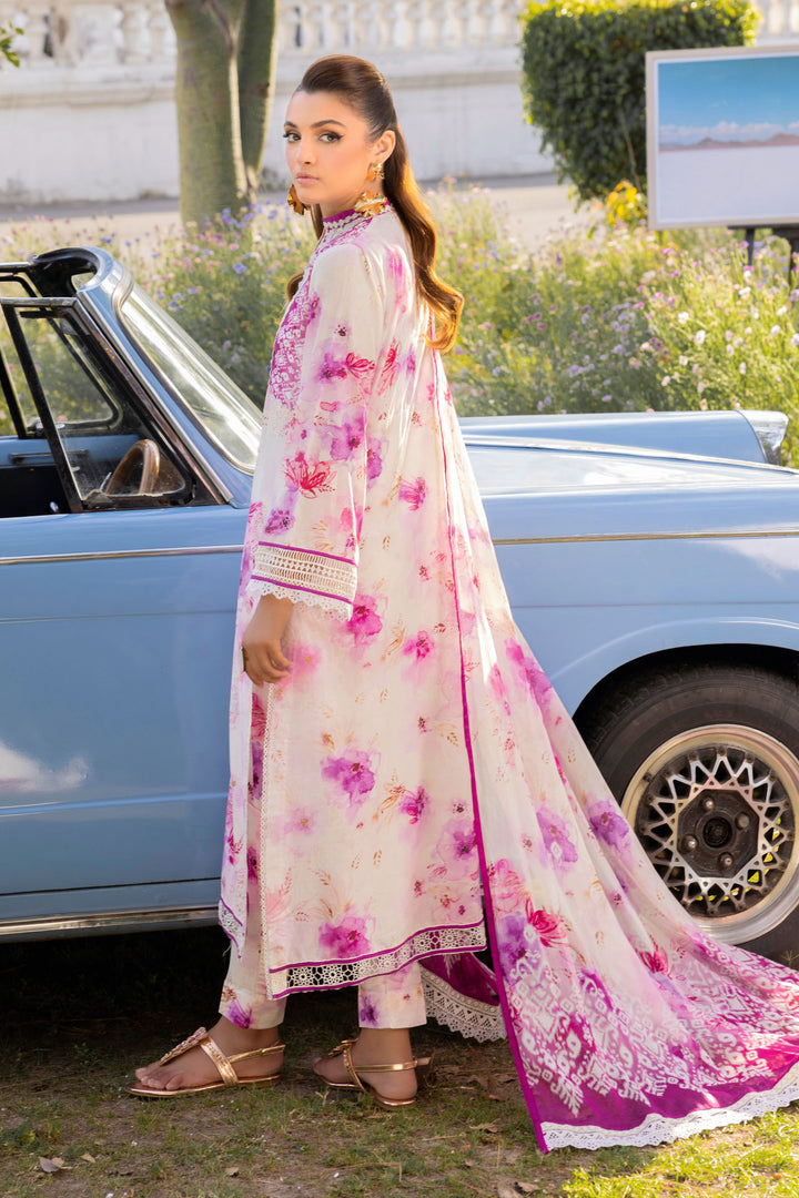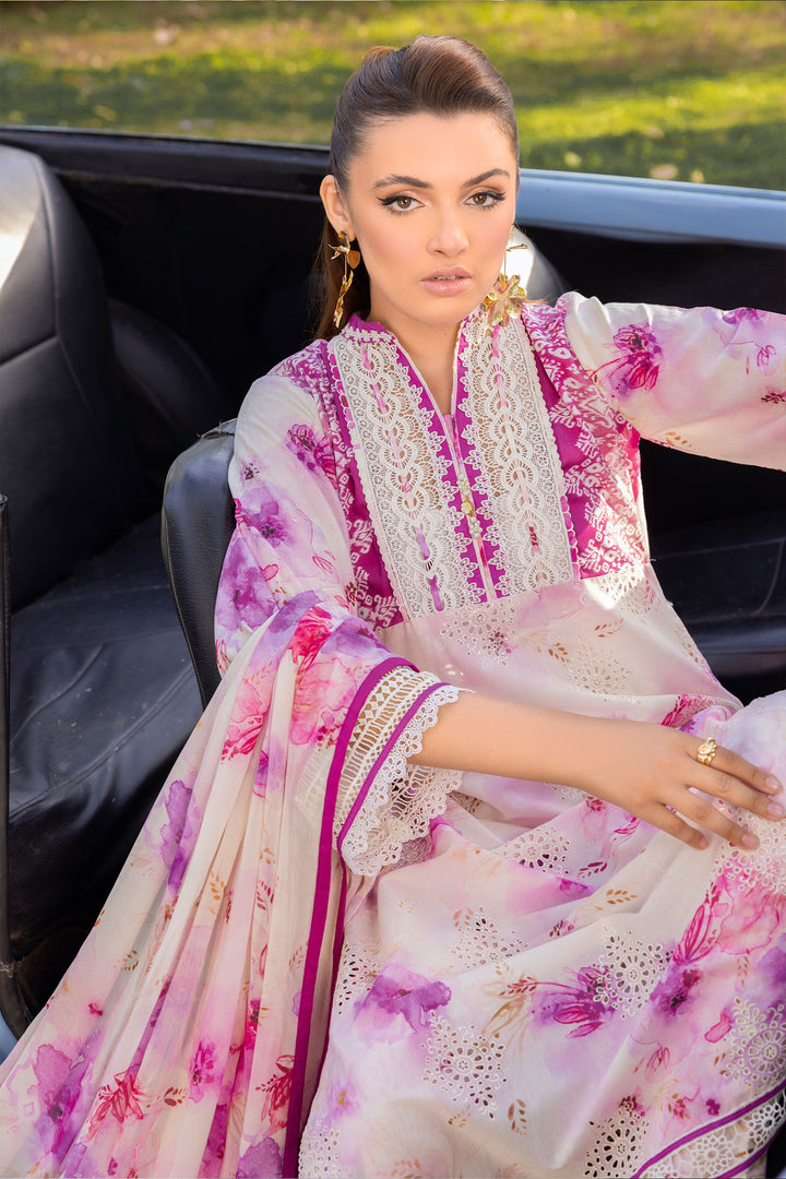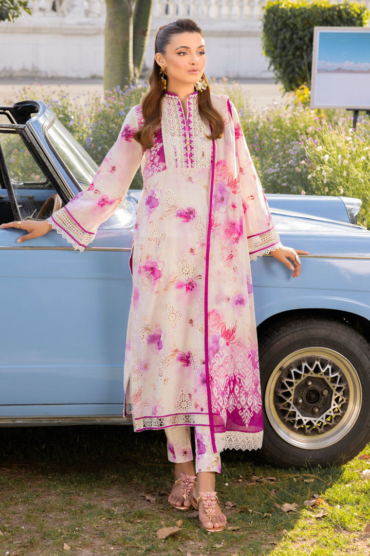 Front fine lawn suit with digital print chicken kari embroidery Dupatta made of chiffon with the same digital print as the suit Trouser crafted from plain cotton