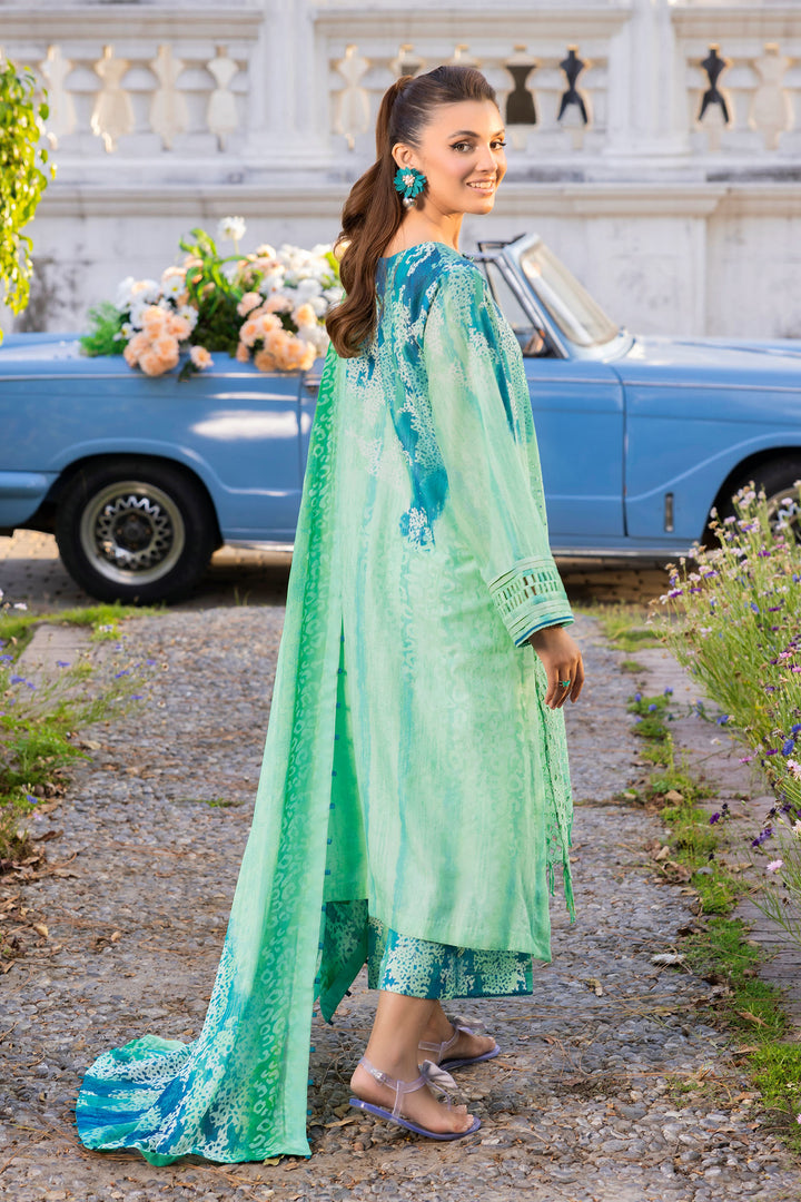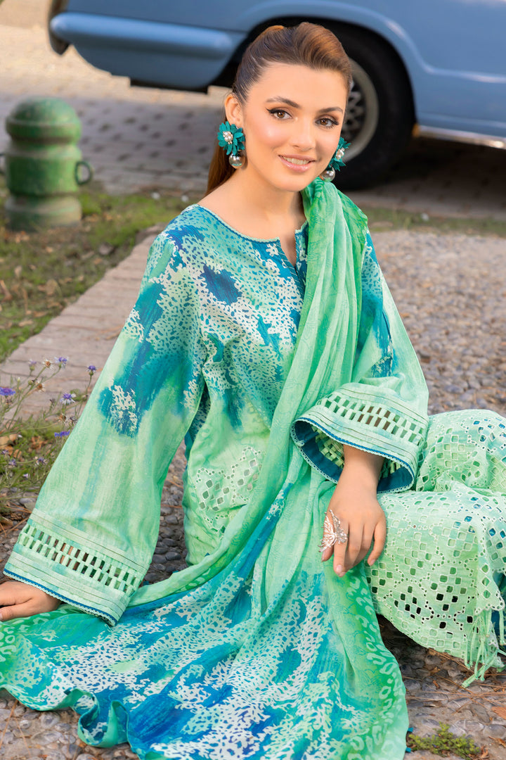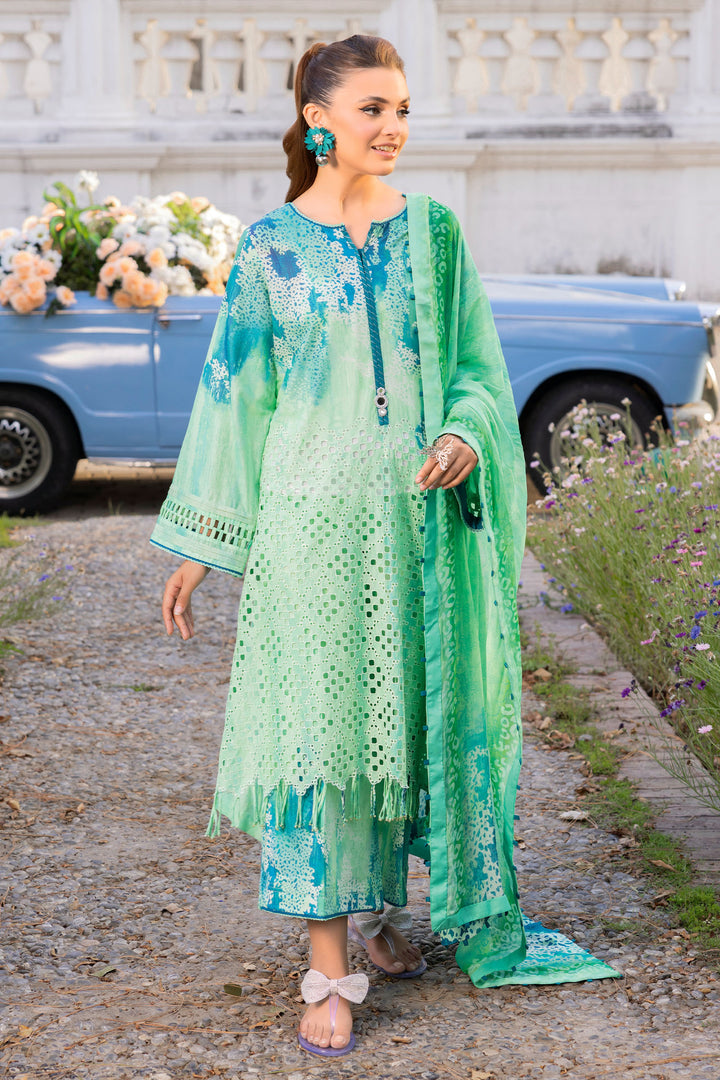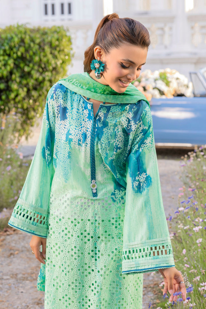 Front fine lawn suit with digital print chicken kari embroidery Dupatta made of chiffon with the same digital print as the suit Trouser crafted from plain cotton