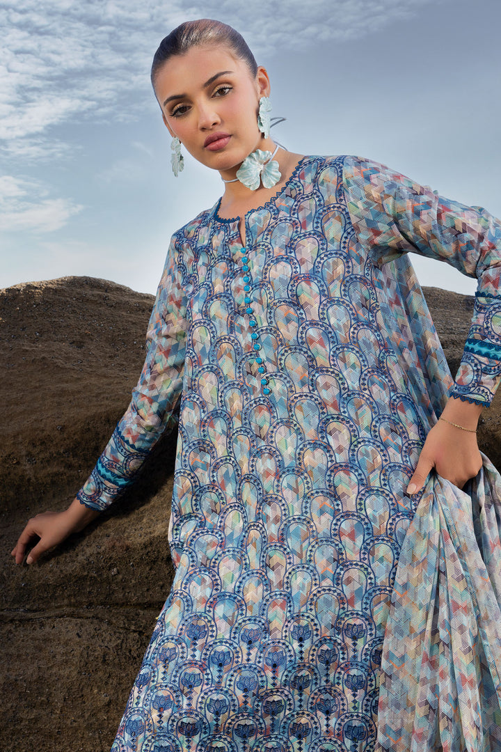 Front Chikankari: 45 inchesBack and Sleeves: 1.5 meters (wider width)Trouser (Printed): 2.5 metersDupatta (Printed): 2.5 meters Price: Rs. 7,895/-